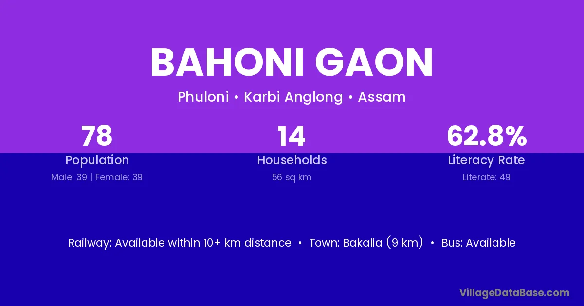 Bahoni Gaon village has a total population of 78 people, of which 39 are males and 39 are females.