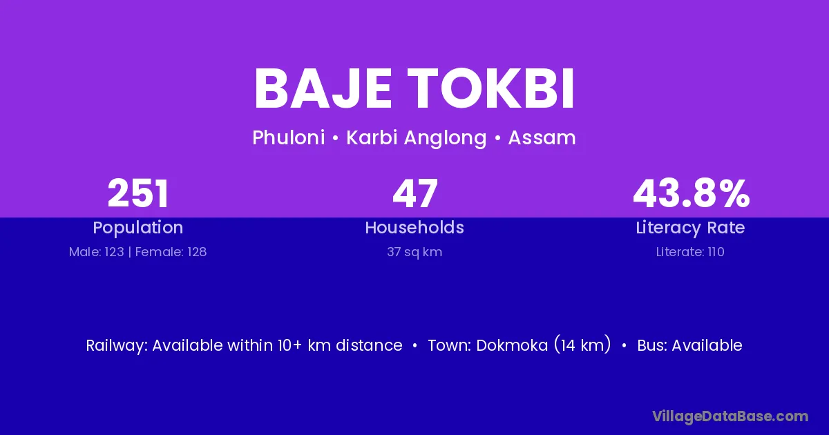 Baje Tokbi village has a total population of 251 people, of which 123 are males and 128 are females.