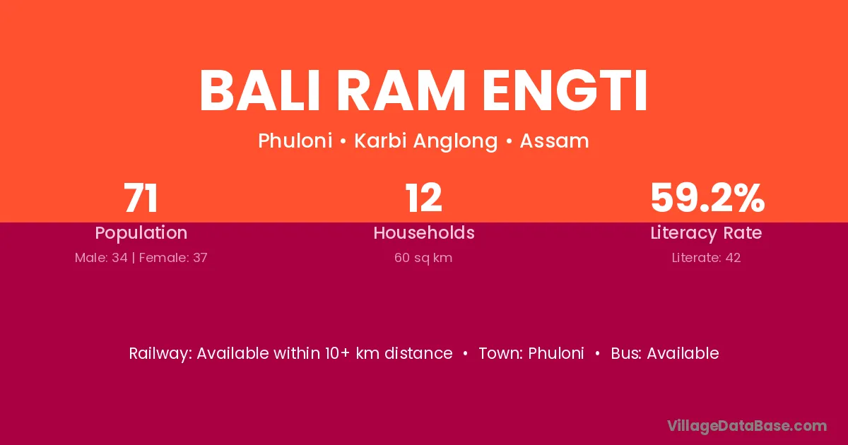 Bali Ram Engti village has a total population of 71 people, of which 34 are males and 37 are females.