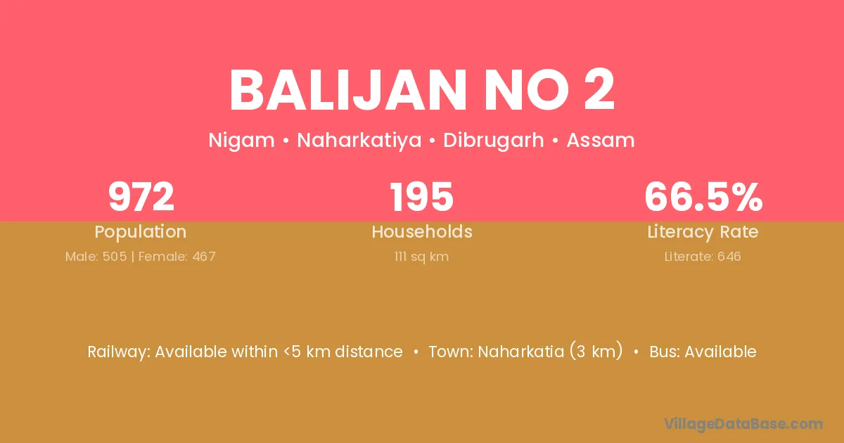 Howraghat (21 km) is the nearest town to Balijan No 2 village for major economic activities and is located approximately 21 km away.