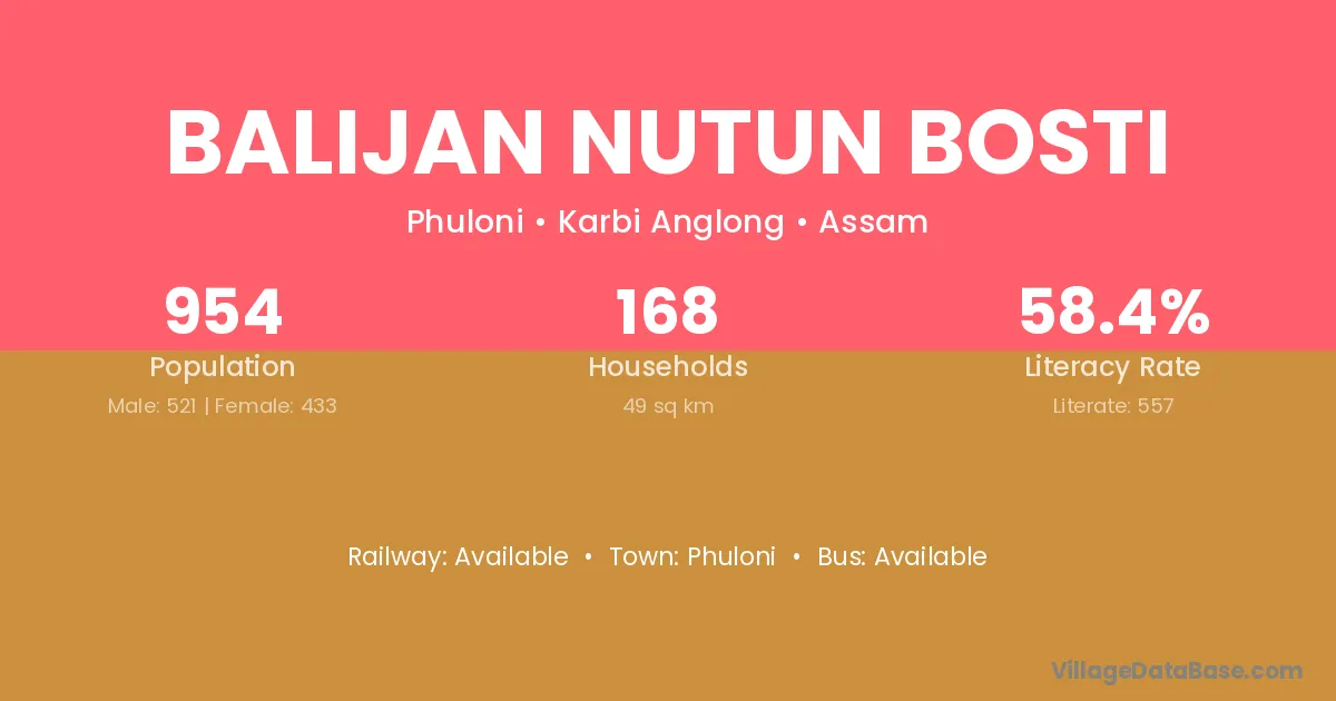 Balijan Nutun Bosti village has a total population of 954 people, of which 521 are males and 433 are females.