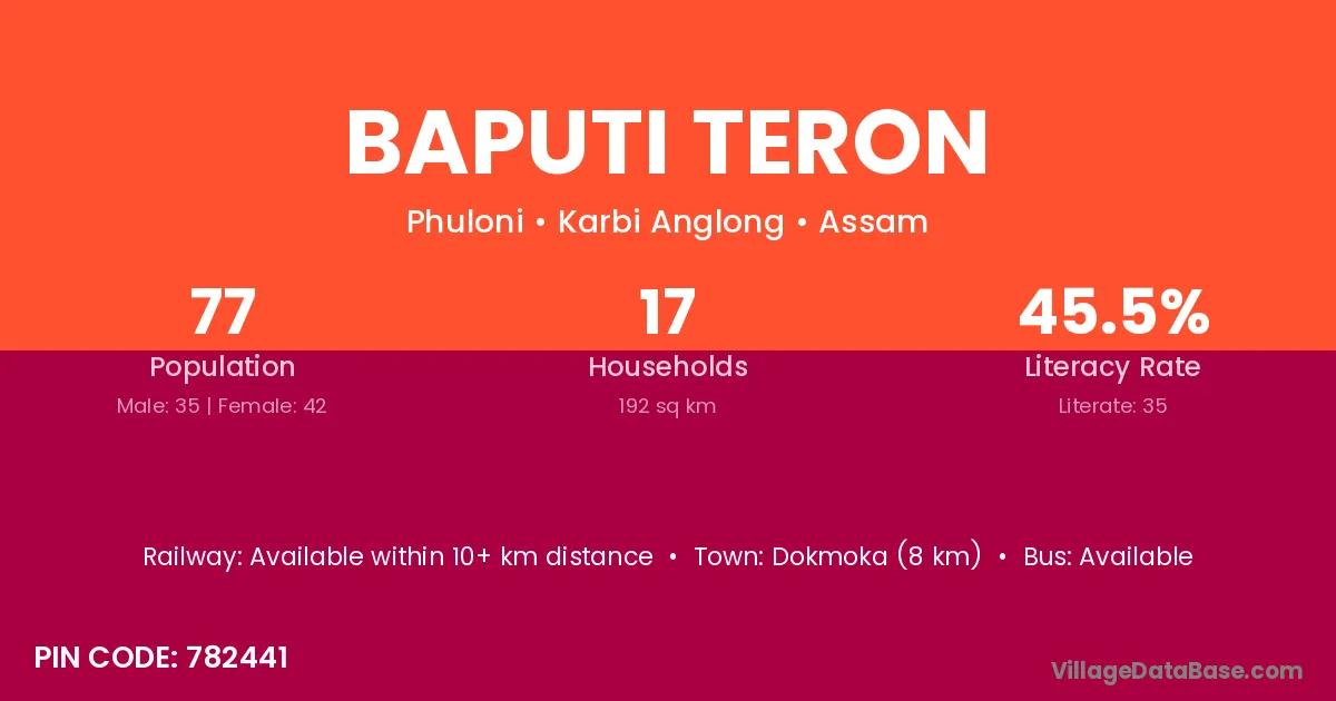 Dokmoka (8 km) is the nearest town to Baputi Teron village for major economic activities and is located approximately 8 km away.