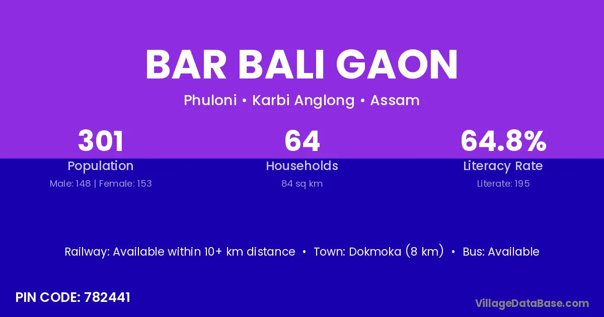 Dokmoka (8 km) is the nearest town to Bar Bali Gaon village for major economic activities and is located approximately 8 km away.