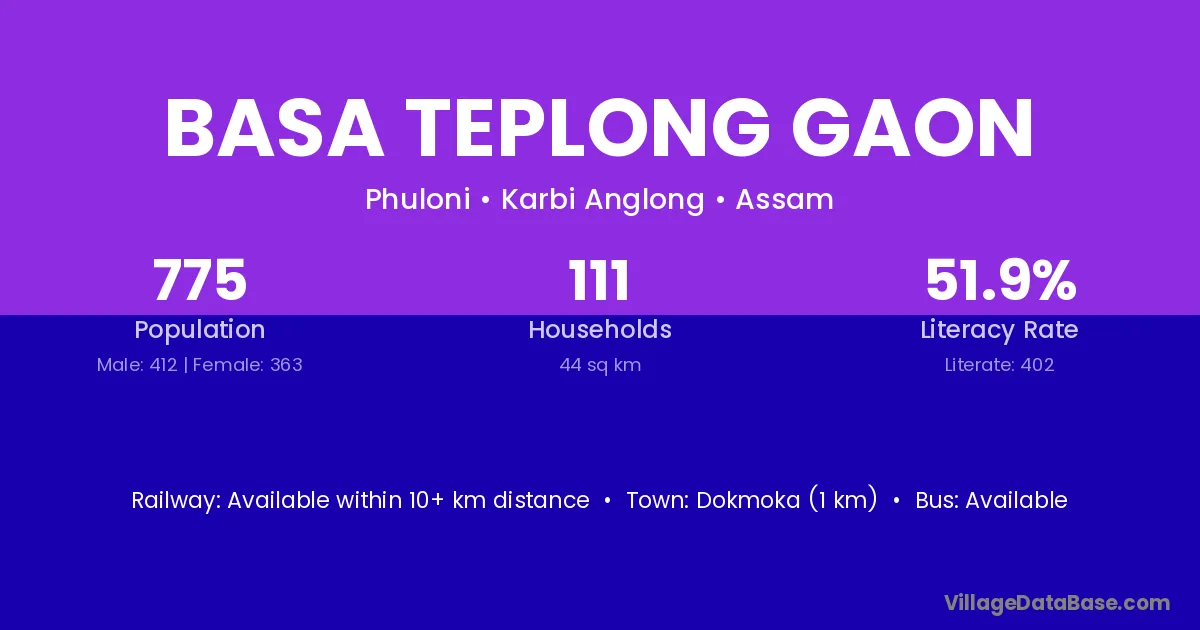 Dokmoka (1 km) is the nearest town to Basa Teplong Gaon village for major economic activities and is located approximately 1 km away.
