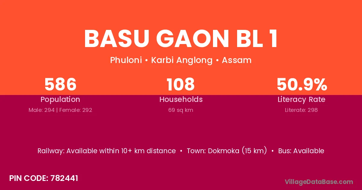 Dokmoka (15 km) is the nearest town to Basu Gaon Bl 1 village for major economic activities and is located approximately 15 km away.