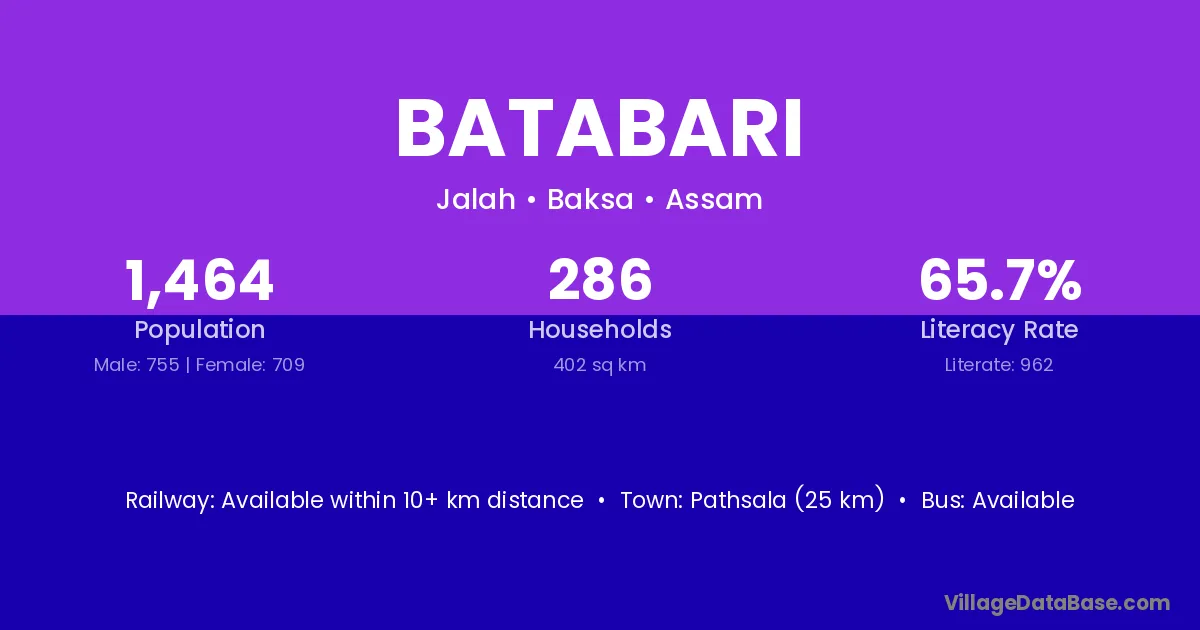 Dokmoka (15 km) is the nearest town to Batabari village for major economic activities and is located approximately 15 km away.