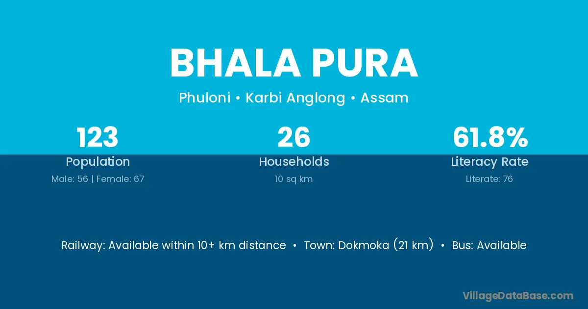 Dokmoka (21 km) is the nearest town to Bhala Pura village for major economic activities and is located approximately 21 km away.