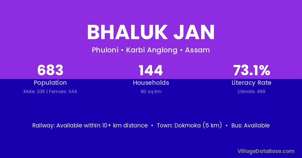 Dokmoka (5 km) is the nearest town to Bhaluk Jan village for major economic activities and is located approximately 5 km away.