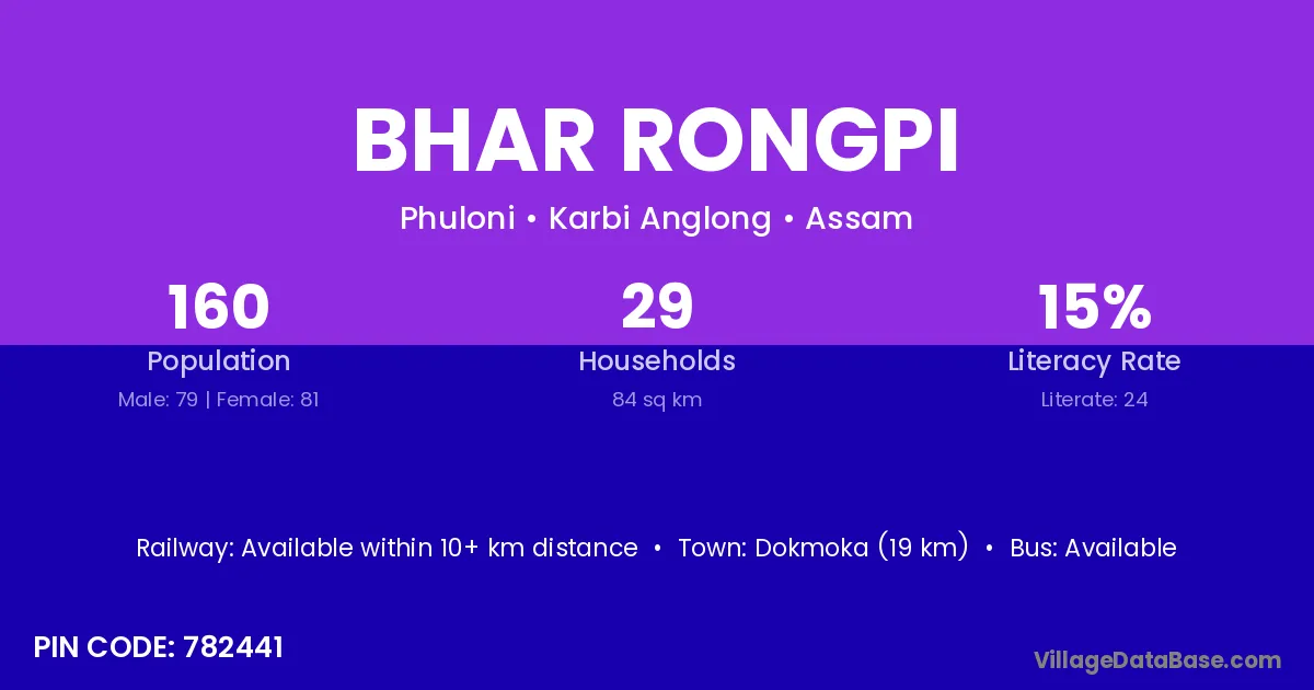 Dokmoka (19 km) is the nearest town to Bhar Rongpi village for major economic activities and is located approximately 19 km away.