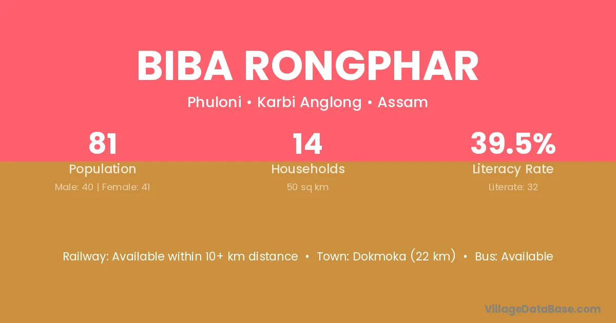 Dokmoka (22 km) is the nearest town to Biba Rongphar village for major economic activities and is located approximately 22 km away.