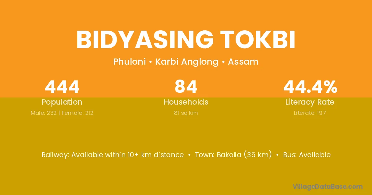 Bakolia (35 km) is the nearest town to Bidyasing Tokbi village for major economic activities and is located approximately 35 km away.