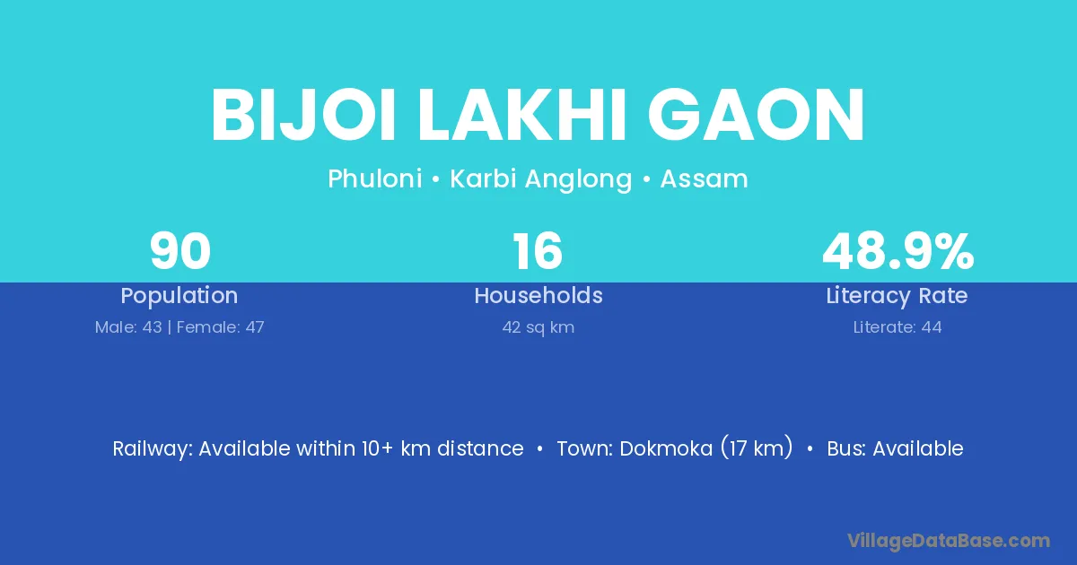 Dokmoka (17 km) is the nearest town to Bijoi Lakhi Gaon village for major economic activities and is located approximately 17 km away.