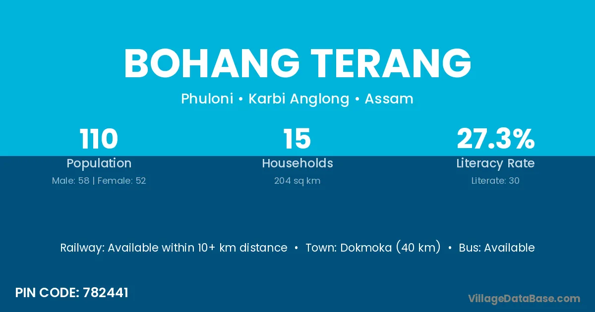 Dokmoka (40 km) is the nearest town to Bohang Terang village for major economic activities and is located approximately 40 km away.