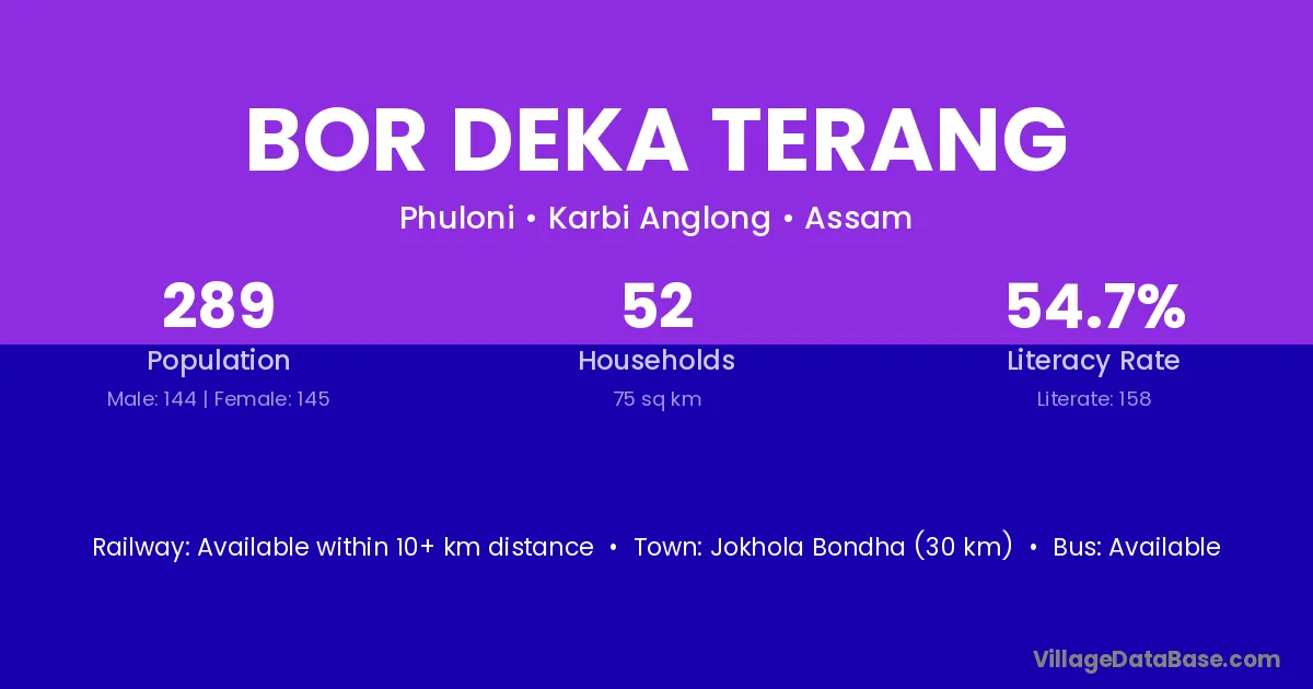 Jokhola Bondha (30 km) is the nearest town to Bor Deka Terang village for major economic activities and is located approximately 30 km away.