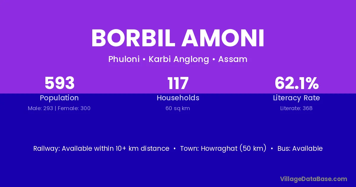 Howraghat (50 km) is the nearest town to Borbil Amoni village for major economic activities and is located approximately 50 km away.
