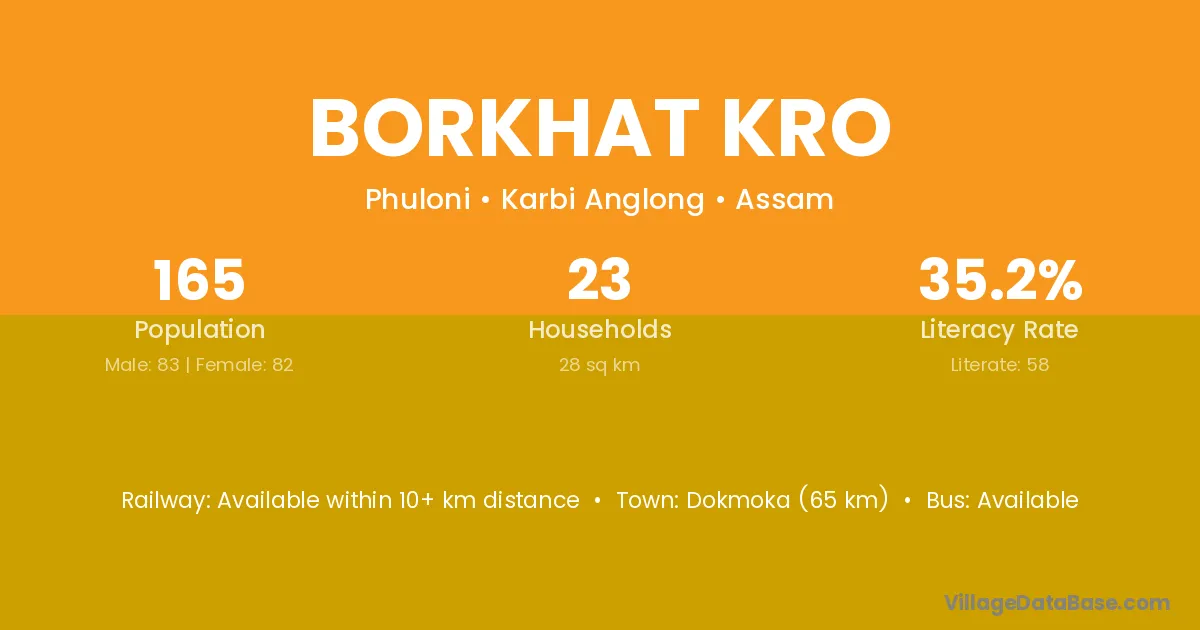 Dokmoka (65 km) is the nearest town to Borkhat Kro village for major economic activities and is located approximately 65 km away.