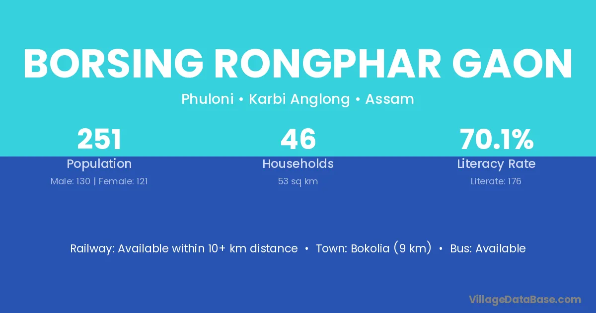 Borsing Rongphar Gaon village has a total population of 251 people, of which 130 are males and 121 are females.