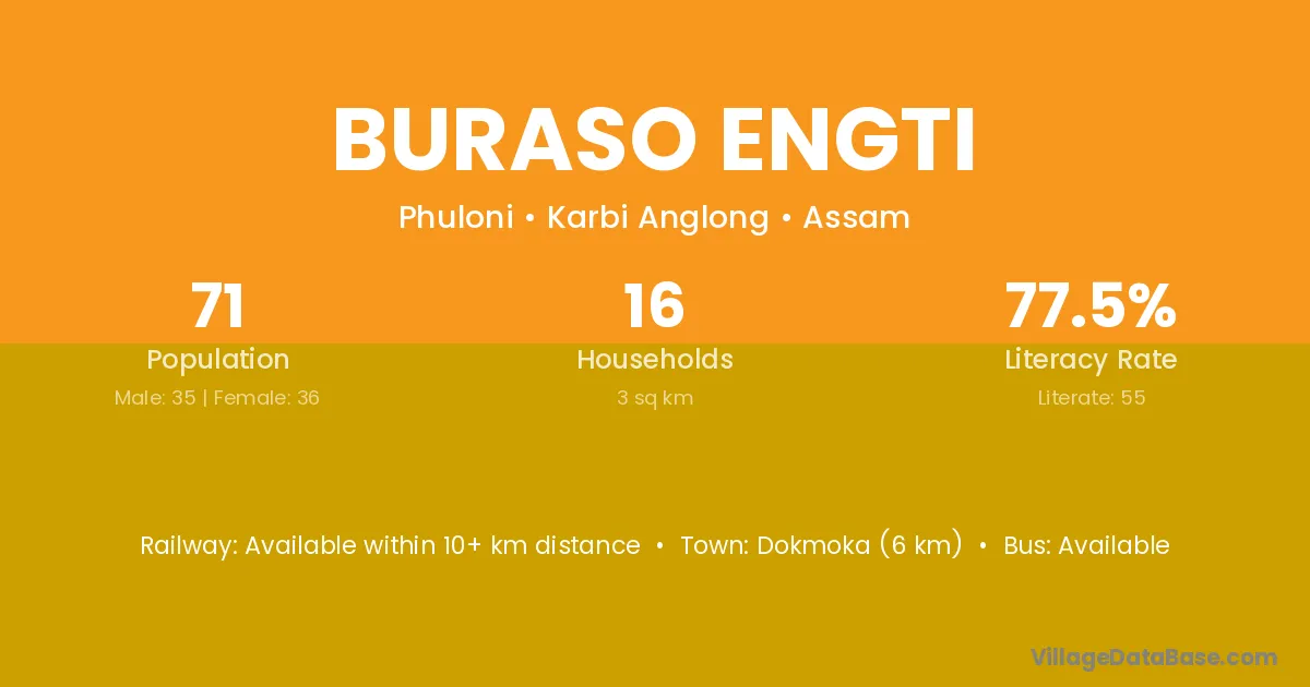 Buraso Engti village has a total population of 71 people, of which 35 are males and 36 are females.