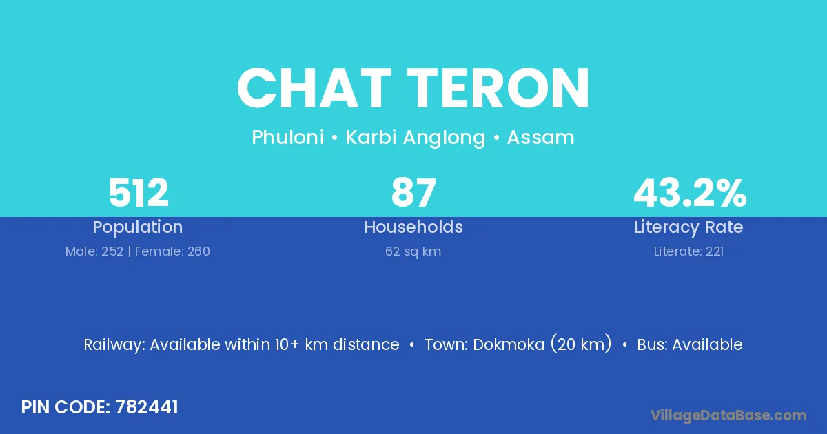 Dokmoka (20 km) is the nearest town to Chat Teron village for major economic activities and is located approximately 20 km away.