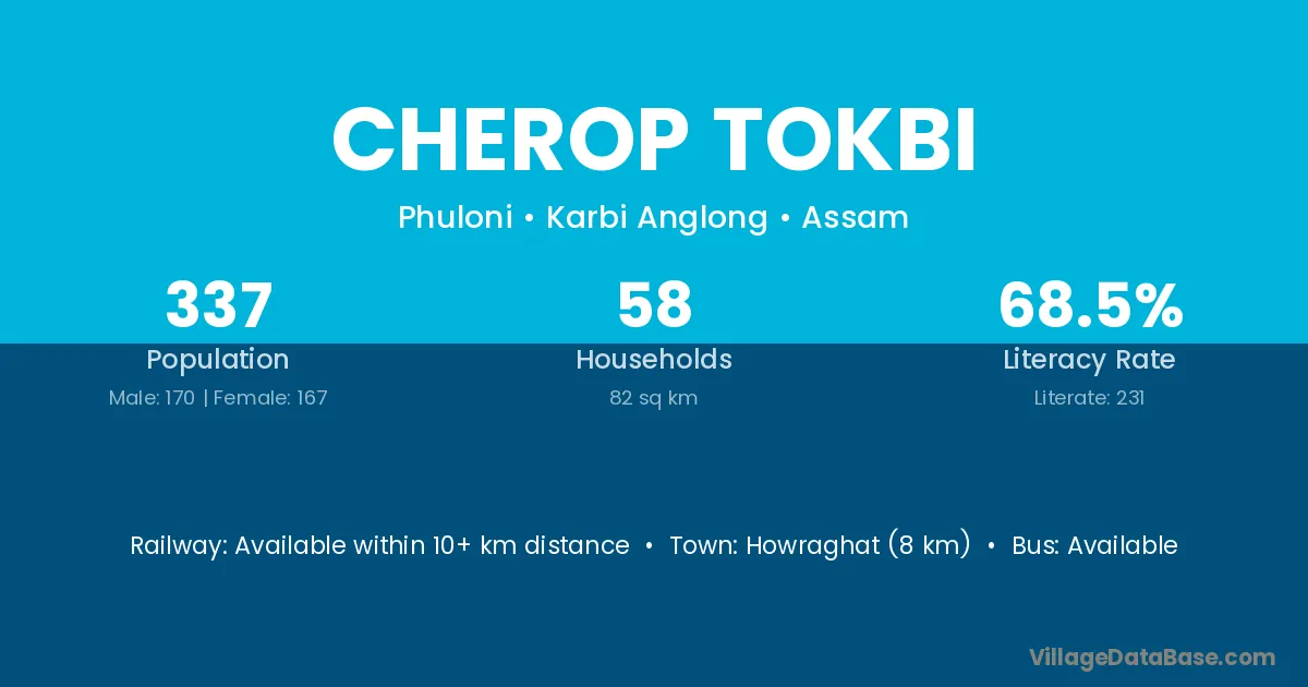 Howraghat (8 km) is the nearest town to Cherop Tokbi village for major economic activities and is located approximately 8 km away.