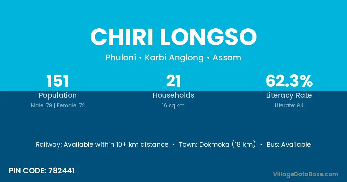 Dokmoka (18 km) is the nearest town to Chiri Longso village for major economic activities and is located approximately 18 km away.