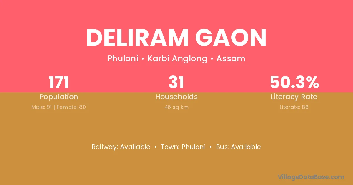 Deliram Gaon village has a total population of 171 people, of which 91 are males and 80 are females.