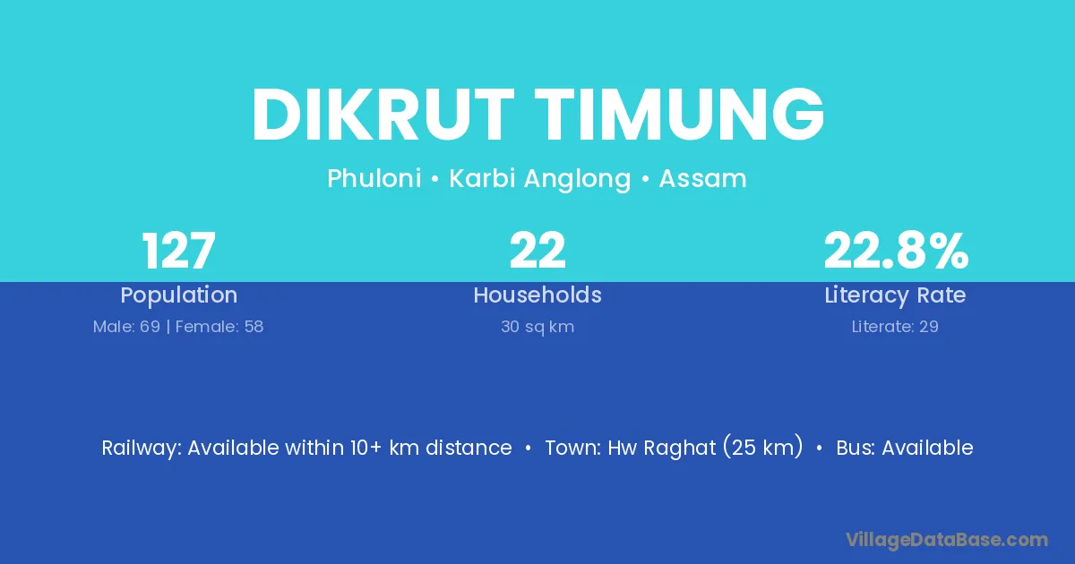 Hw Raghat (25 km) is the nearest town to Dikrut Timung village for major economic activities and is located approximately 25 km away.