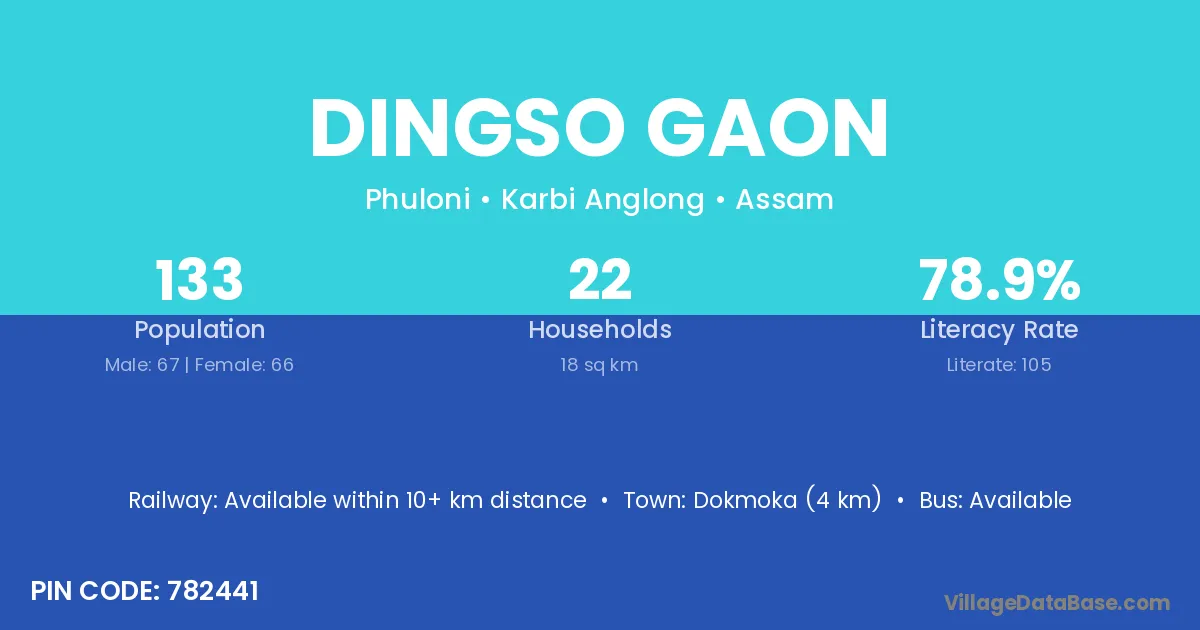 Dokmoka (4 km) is the nearest town to Dingso Gaon village for major economic activities and is located approximately 4 km away.
