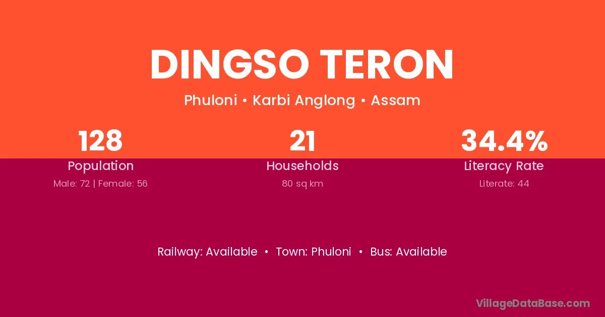 Dingso Teron village has a total population of 128 people, of which 72 are males and 56 are females.
