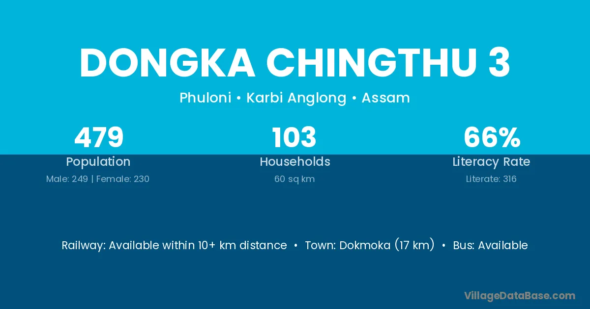 Dokmoka (17 km) is the nearest town to Dongka Chingthu 3 village for major economic activities and is located approximately 17 km away.