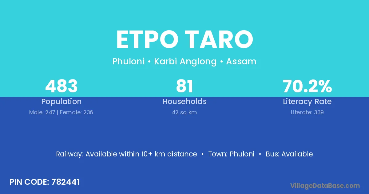 Etpo Taro village has a total population of 483 people, of which 247 are males and 236 are females.