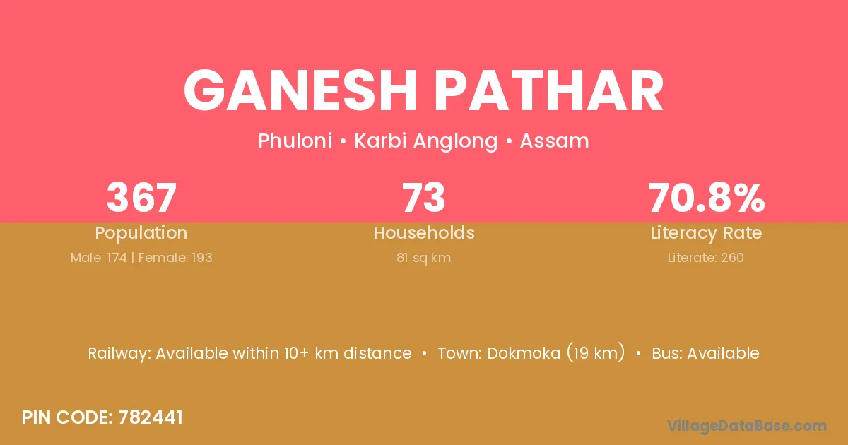 Dokmoka (19 km) is the nearest town to Ganesh Pathar village for major economic activities and is located approximately 19 km away.