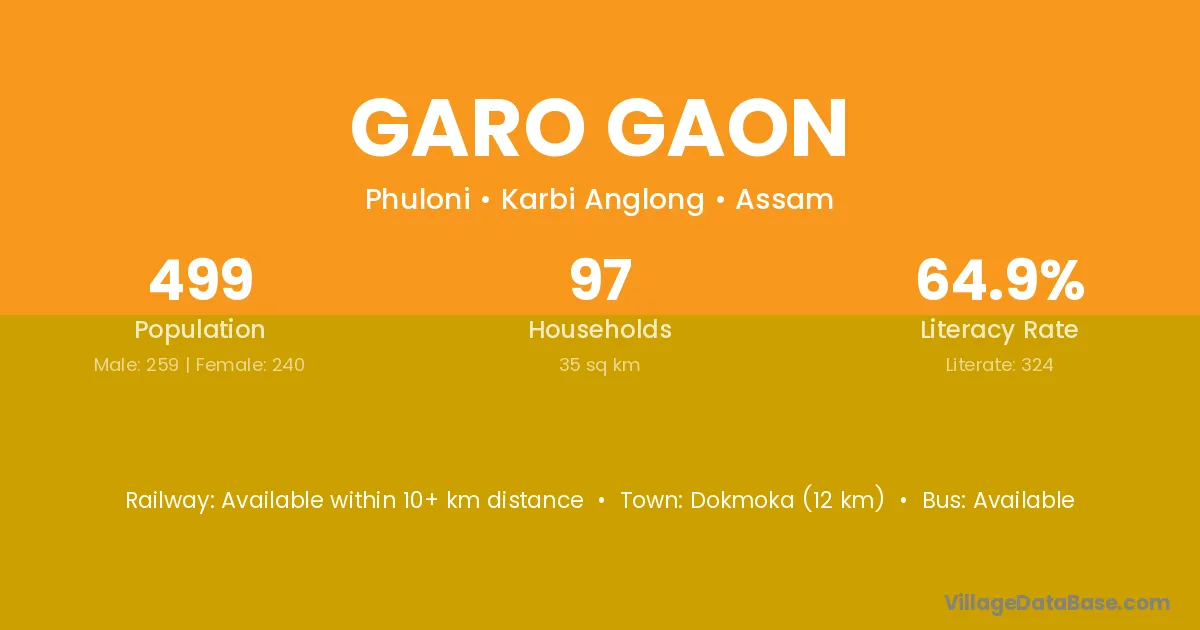 Dokmoka (12 km) is the nearest town to Garo Gaon village for major economic activities and is located approximately 12 km away.