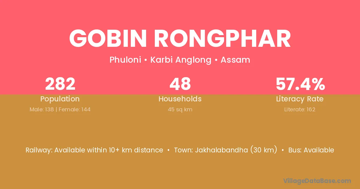 Gobin Rongphar village has a total population of 282 people, of which 138 are males and 144 are females.