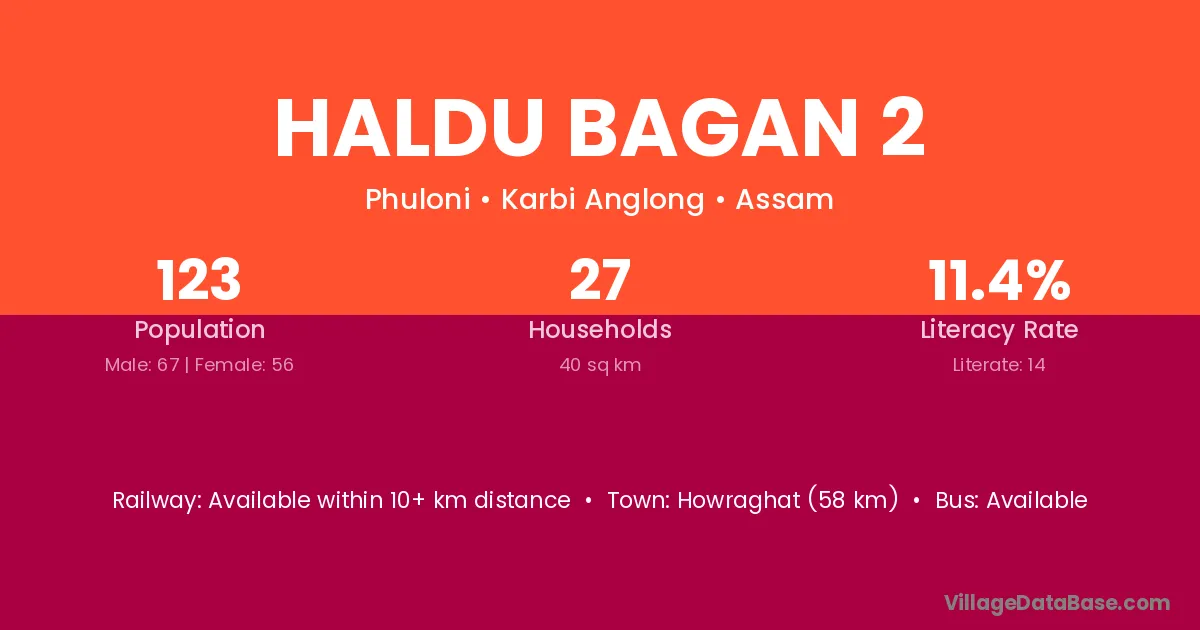 Howraghat (58 km) is the nearest town to Haldu Bagan 2 village for major economic activities and is located approximately 58 km away.