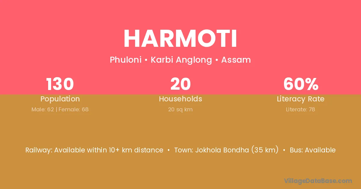 Harmoti village has a total population of 130 people, of which 62 are males and 68 are females.