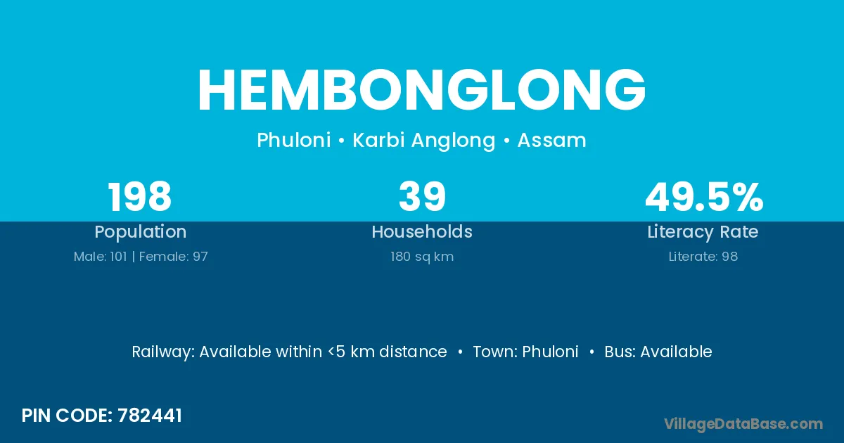 Hembonglong village has a total population of 198 people, of which 101 are males and 97 are females.