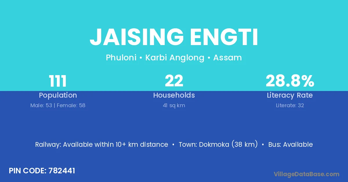 Dokmoka (38 km) is the nearest town to Jaising Engti village for major economic activities and is located approximately 38 km away.