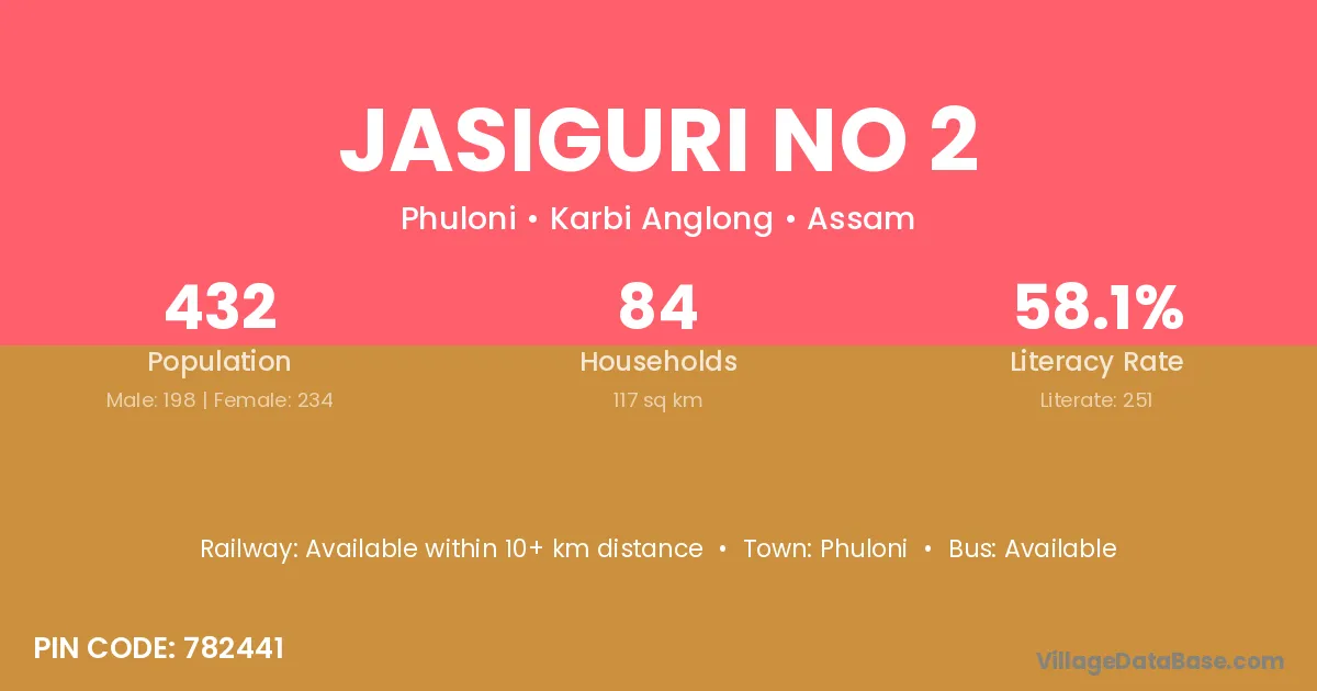 Jasiguri No 2 village has a total population of 432 people, of which 198 are males and 234 are females.