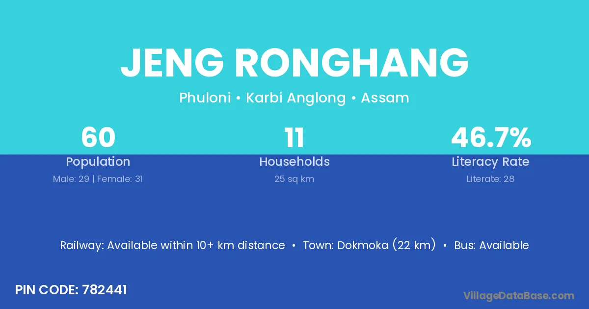 Dokmoka (22 km) is the nearest town to Jeng Ronghang village for major economic activities and is located approximately 22 km away.