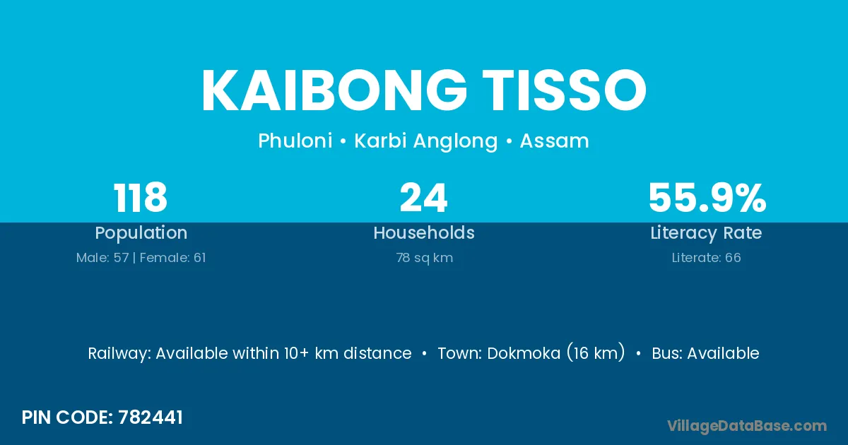 Dokmoka (16 km) is the nearest town to Kaibong Tisso village for major economic activities and is located approximately 16 km away.