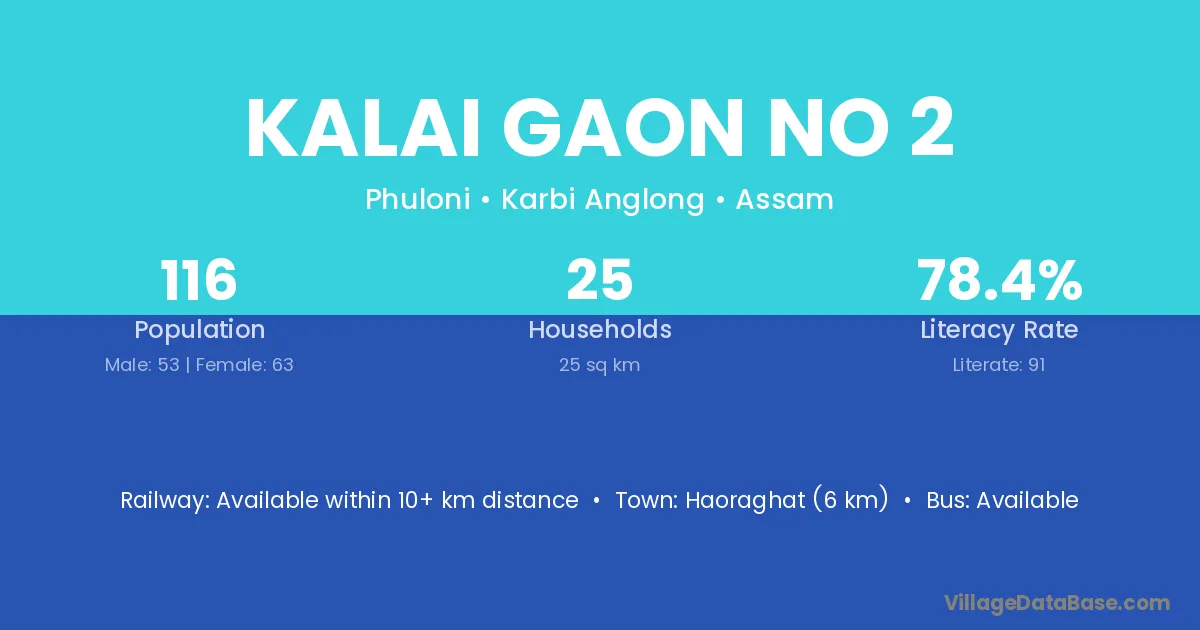 Kalai Gaon No 2 village has a total population of 116 people, of which 53 are males and 63 are females.