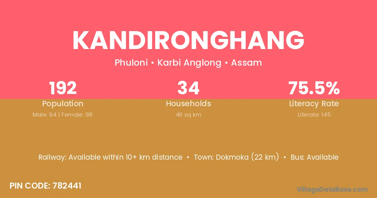 Dokmoka (22 km) is the nearest town to Kandironghang village for major economic activities and is located approximately 22 km away.