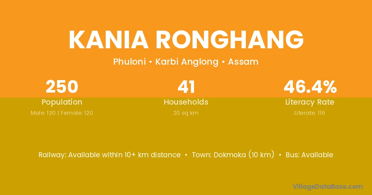 Kania Ronghang village has a total population of 250 people, of which 130 are males and 120 are females.