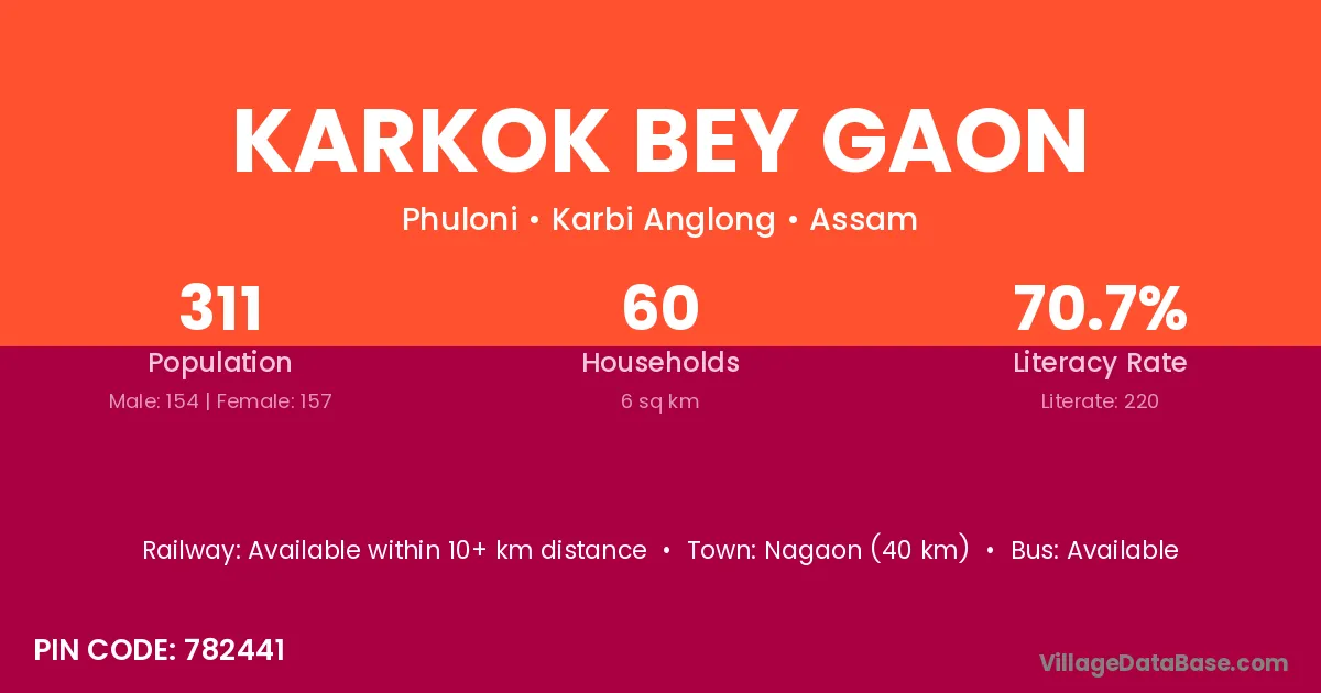 Nagaon (40 km) is the nearest town to Karkok Bey Gaon village for major economic activities and is located approximately 40 km away.