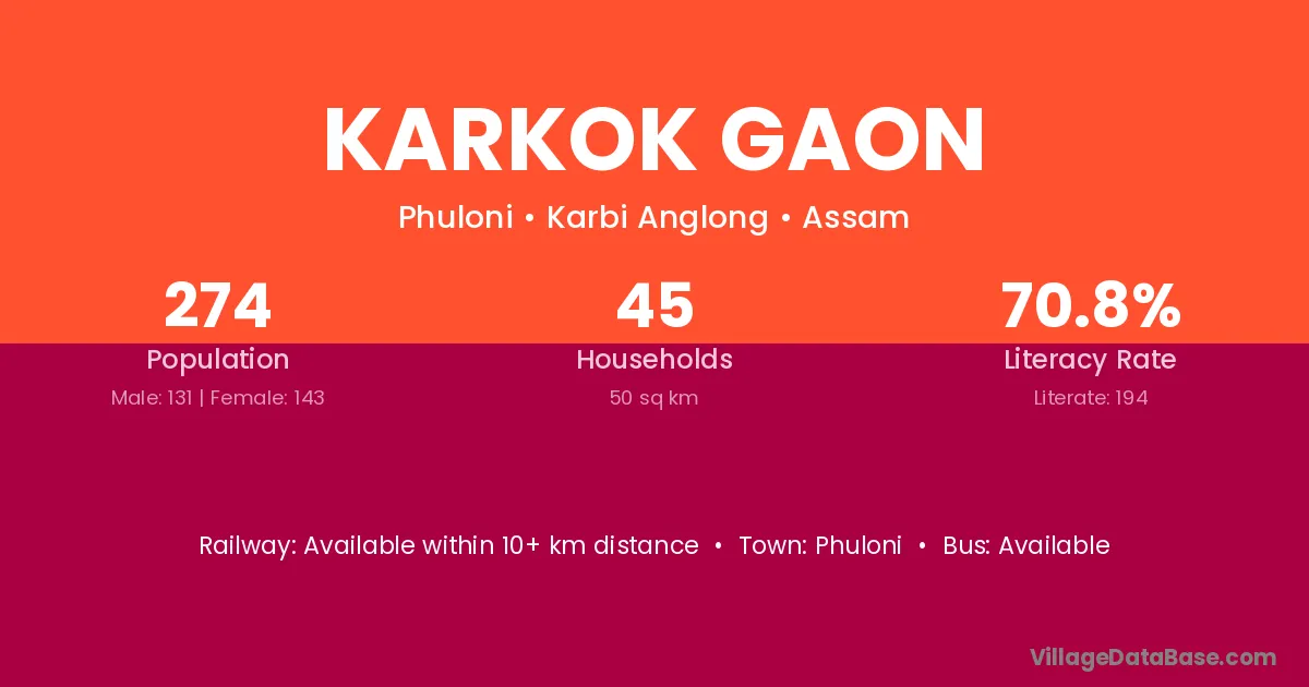 Karkok Gaon village has a total population of 274 people, of which 131 are males and 143 are females.