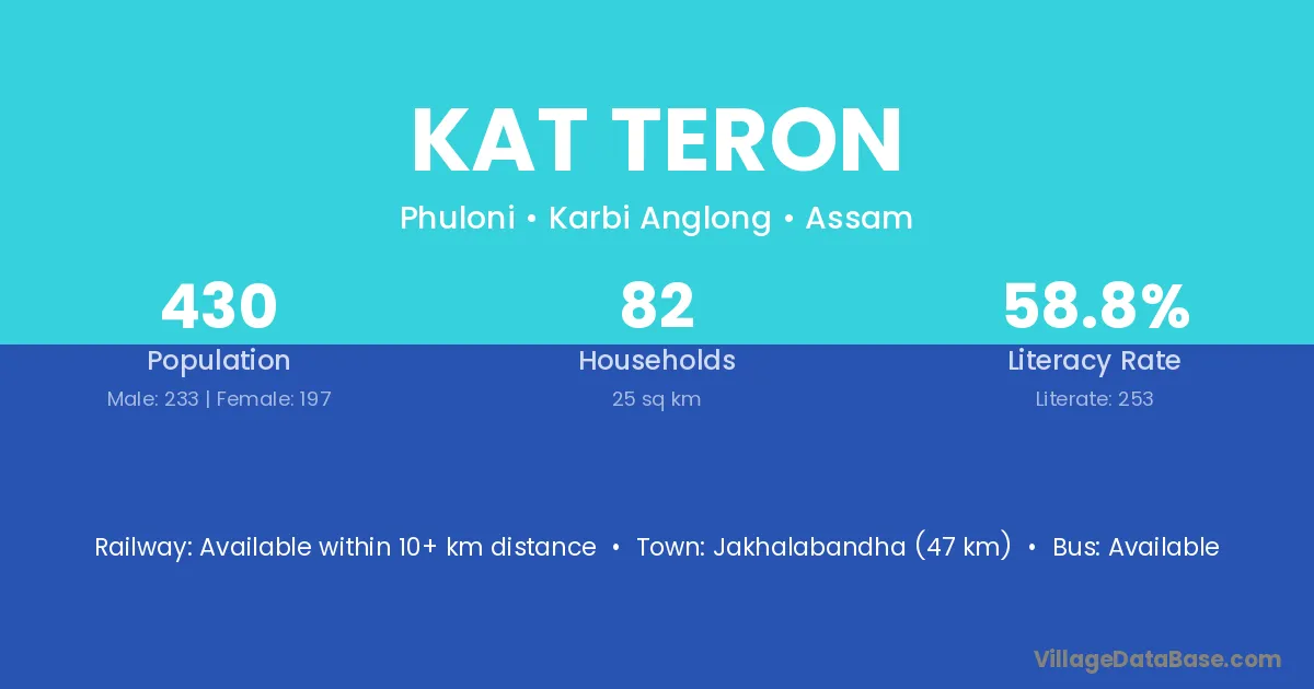 Jakhalabandha (47 km) is the nearest town to Kat Teron village for major economic activities and is located approximately 47 km away.