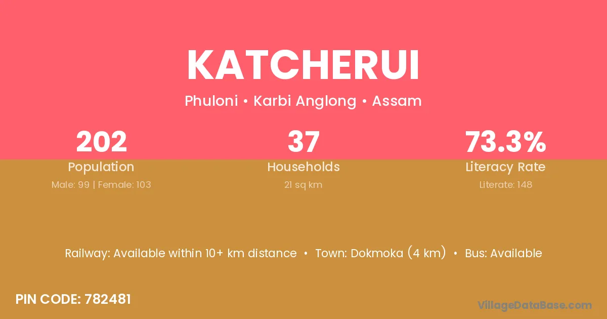 Dokmoka (4 km) is the nearest town to Katcherui village for major economic activities and is located approximately 4 km away.