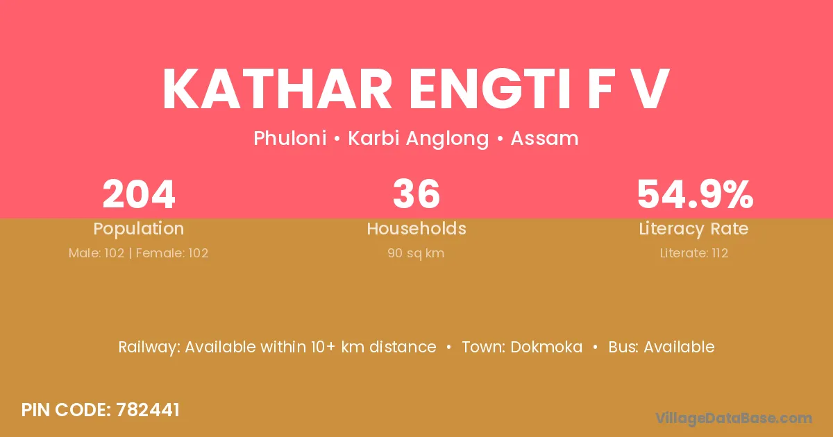 Kathar Engti F V village has a total population of 204 people, of which 102 are males and 102 are females.
