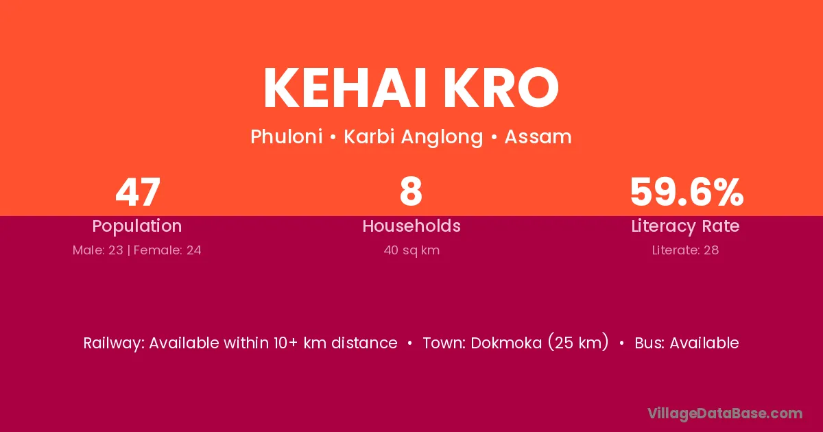 Kehai Kro village has a total population of 47 people, of which 23 are males and 24 are females.